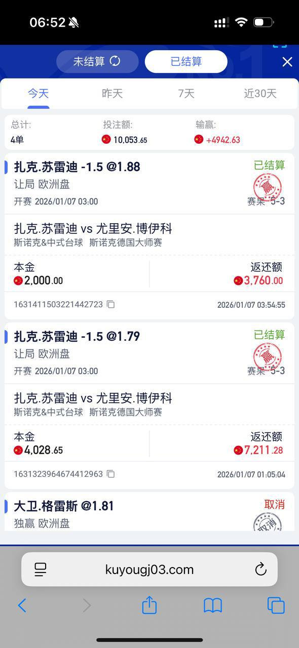 事情经过是这样的:1月6日傍晚,我先砸4000块买斯诺克德国大师赛“大卫·格雷斯 vs 伊恩·伯恩斯”初盘,结果格雷斯直接弃权,钱没结算。接着我又存4000继续买下一场“扎克·舒尔第 vs 尤利安·博伊科”,比分到1-1时,第一场终于结算,我再补2000块继续玩。比赛打完赚了点,申请提现就去睡了。醒来一看,账号没了!